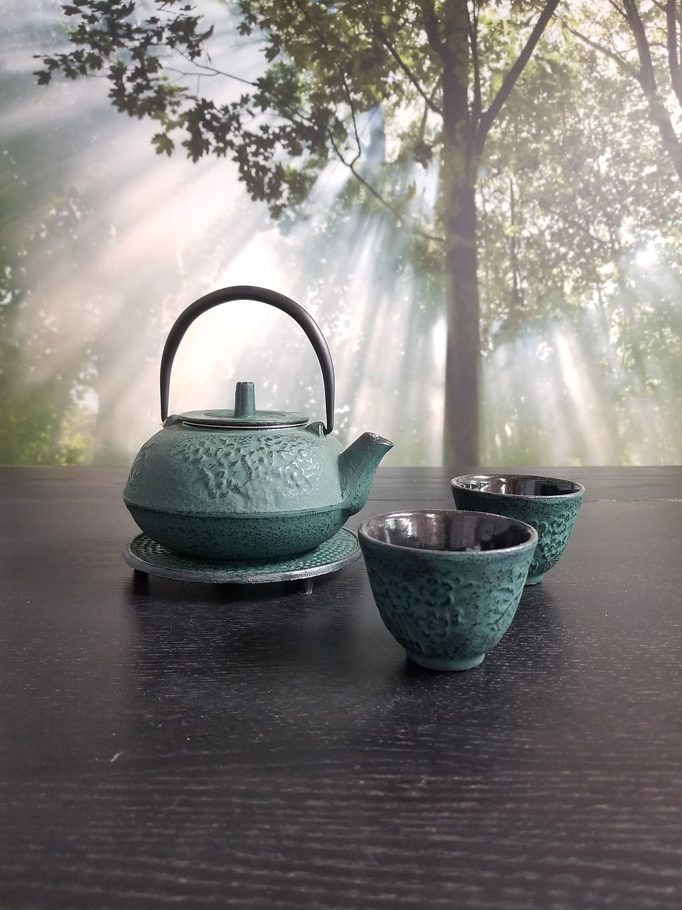 Tea Pot Cast Iron With Cups Green
